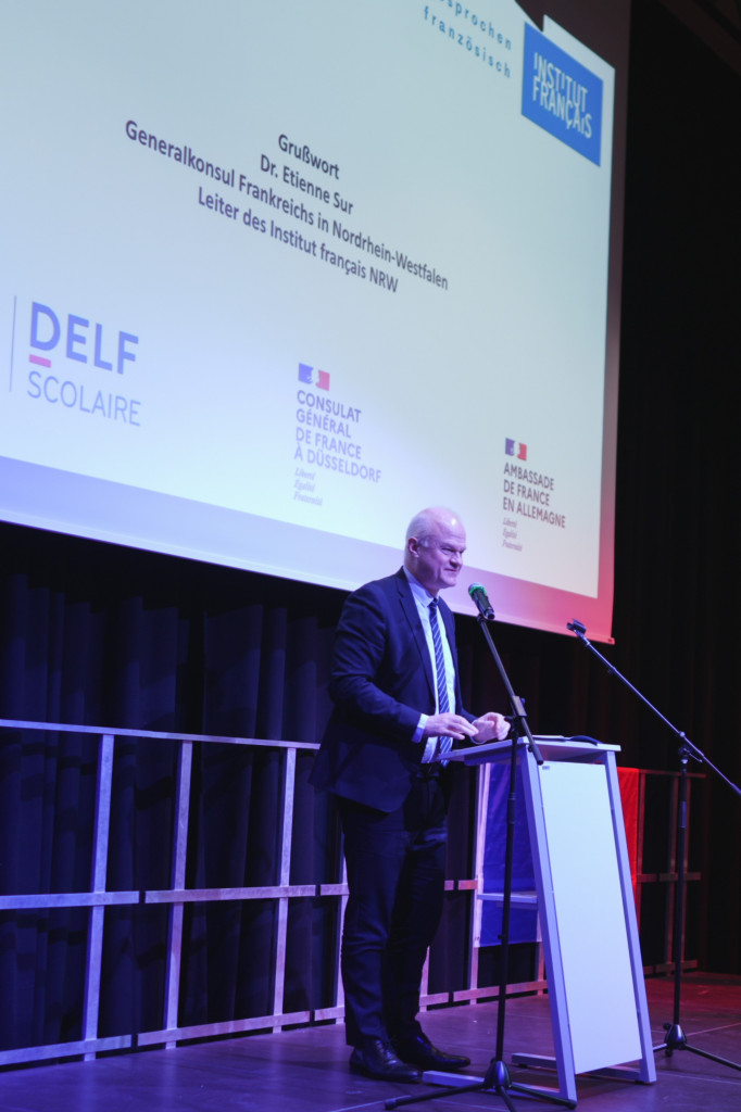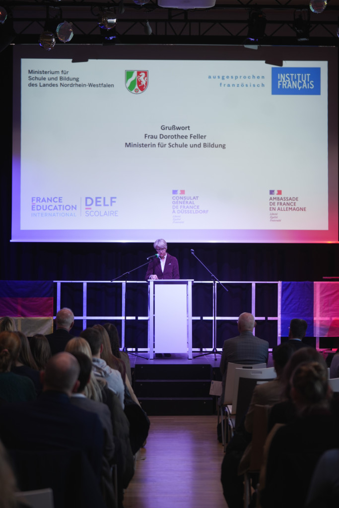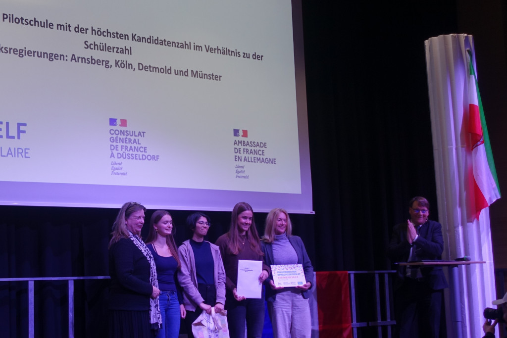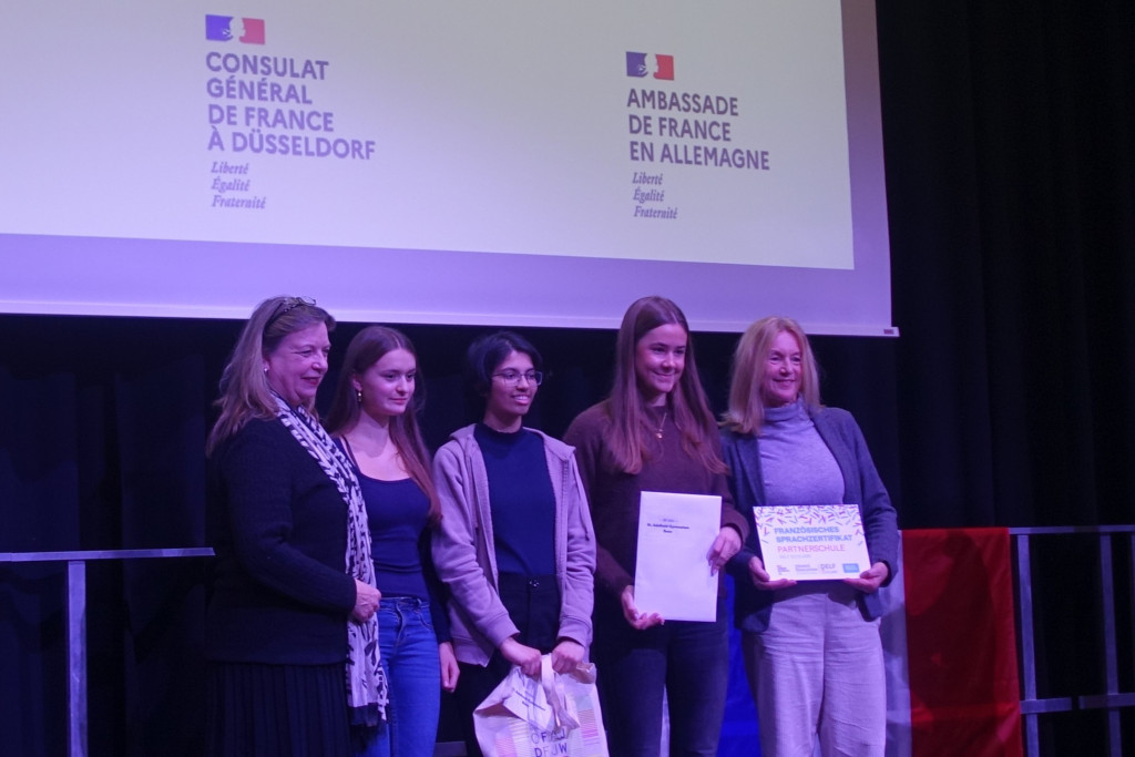 Eine Veranstaltung der Superlative! Damit hatten Lilo, Ananya und Victoria – drei der besten DELF-Schülerinnen des Jahrgangs 2025 am SAG – nicht gerechnet, als ihnen gemeinsam mit Frau Neuhaus am vergangenen Freitag in Düsseldorf anlässlich der feierlichen Zertifikatsübergabe die Plakette „DELF-PARTNERSCHULE“ im Beisein von Frau Ministerin Feller überreicht wurde. Wie fing alles an?