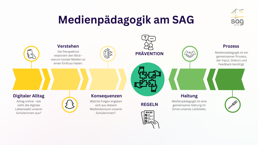 Dafür ist es vor allem wichtig, den digitalen Alltag unserer Schülerinnen zu kennen, die Ursachen für unreflektierten und übermäßigen Konsum zu verstehen, um nicht aus einer Vorverurteilung heraus den Jugendlichen zu begegnen. Konsequenzen, Gefahren, Herausforderungen muss letztlich mehr entgegnet werden als die oftmals auf ein „entweder oder“ reduzierte Diskussion in den Medien zwischen Prävention und Verboten. Prävention und Regulation sollen sich sinnvoll ergänzen und — auch unter Einbezug der Medienscouts, des Kollegiums und der Eltern — gezielt bei den Ursachen und Risiken ansetzen, statt pauschal und ohne Bezug Anwendung zu finden. So unterstützt unser medienpädagogisches Konzept am SAG unsere Schülerinnen und macht Schule zu einem sicheren Raum.