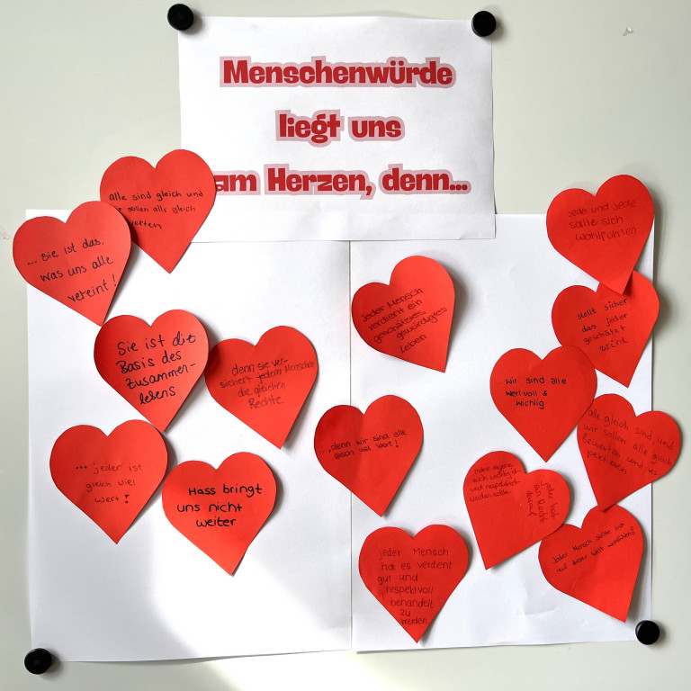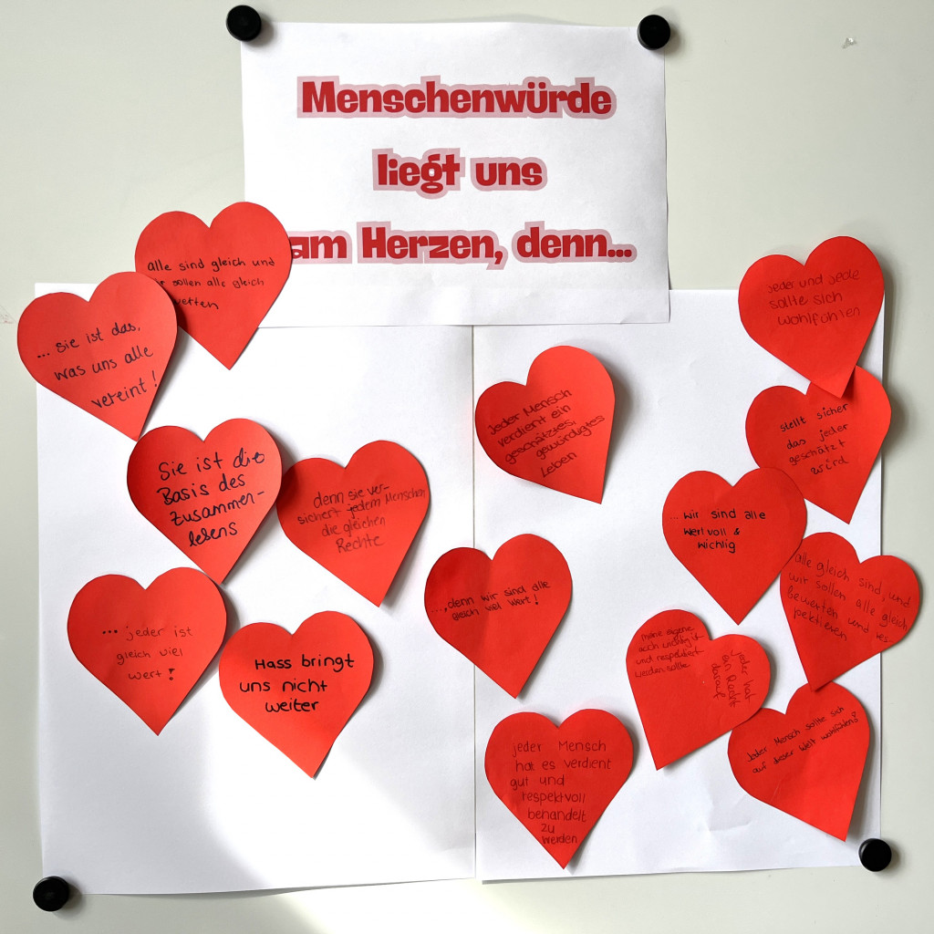 Am Dienstag, den 24. März 2026 besuchten zwei Referentinnen des Vereins für Demokratie und Menschenwürde e. V. die Schülerinnen des ev. Religionskurses in der EF. Zunächst sollte jede überlegen, welcher Person sie im Falle einer unheilbaren Krankheit die Wunderpille geben würde. Diese eine Person würde dadurch gerettet. Zur Auswahl standen sechs verschiedene Menschen. Nach jeder Entscheidungsrunde erfuhren die Teilnehmerinnen mehr über die jeweiligen Personen. Dies führte dazu, dass fast niemand immer die gleiche Person auswählte, der sie die Wunderpille geben würde. Im Anschluss daran wurde der Begriff Würde definiert. Anhand von echten Fallbespielen sollte in Kleingruppen diskutiert werden, ob es sich um Würdeverletzungen handelte. Zum Abschluss erarbeiteten die Schülerinnen Möglichkeiten, wie sie sich im Alltag für Menschenwürde einsetzen und für sie einstehen können. Zur Erinnerung gab es für alle noch einen Pin oder eine Postkarte. Wir danken den Referentinnen sehr herzlich für die Impulse zu diesem bereichernden Gespräch.