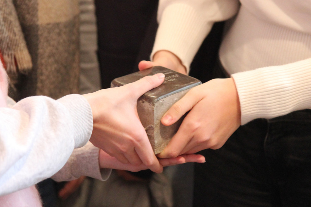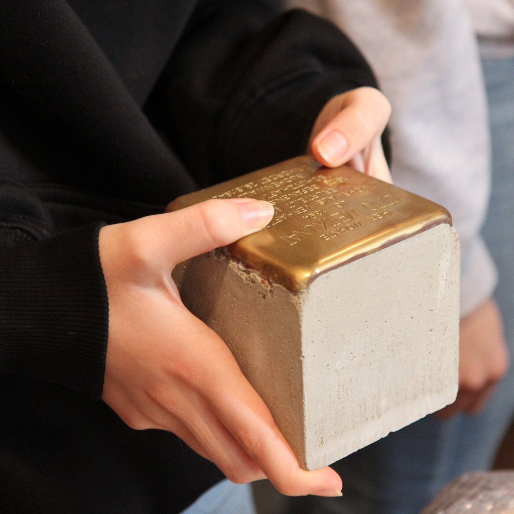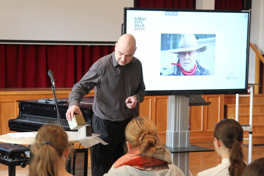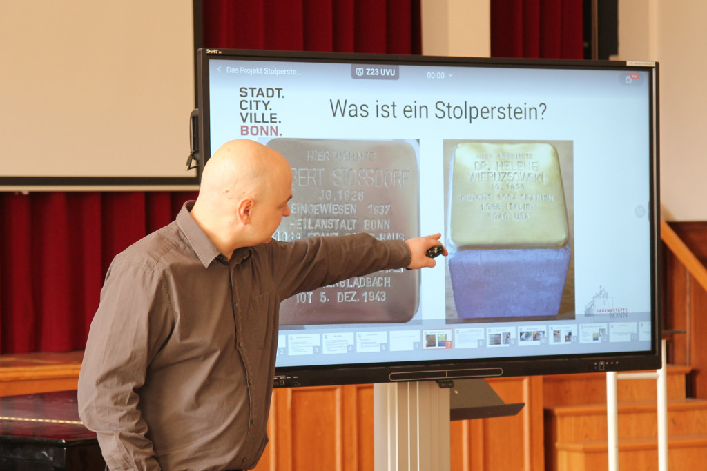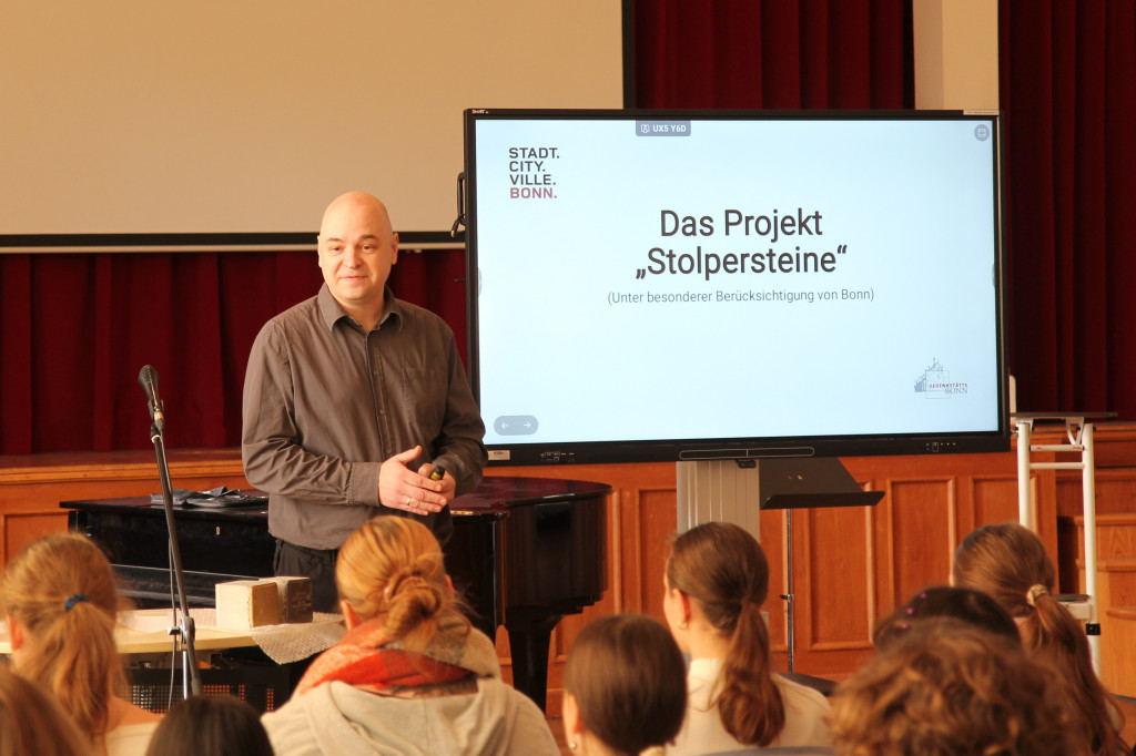 Anlässlich des Gedenktages an die Reichspogromnacht fand am 20. November für die Klassen 10b und 10c ein Vortrag im Theatersaal mit anschließendem Austausch statt. Herr Dzieran von der Bonner Gedenkstätte für die Opfer des Nationalsozialismus, der dort das Projekt „Stolpersteine“ betreut, berichtete über die Entstehung und Bedeutung dieser besonderen Gedenksteine. Im Mittelpunkt stand dabei der Leitspruch des Projekts: „Ein Mensch ist erst vergessen, wenn sein Name vergessen ist!“ (Gunter Demnig). Um die Wirkung der Steine unmittelbar erfahrbar zu machen, hatte Herr Dzieran auch mehrere Stolpersteine mitgebracht. Die Schülerinnen konnten sie in die Hand nehmen und so Gewicht, Material und Gestaltung aus nächster Nähe kennenlernen. Die Idee der Stolpersteine wurde 1993 vom Künstler Gunter Demnig entwickelt. 1996 wurde der erste Stein verlegt – heute existieren rund 120.000 Stolpersteine in über 30 europäischen Ländern. Dieses Kunst-Denkmal ist damit das größte dezentrale Mahnmal der Welt. Jeder einzelne Stein wird weiterhin von Gunter Demnig selbst von Hand gefertigt. In Bonn liegen derzeit 440 Stolpersteine; im Juni 2026 sollen weitere 70 hinzukommen. Herr Dzieran erläuterte zudem, wie umfangreich die Arbeit hinter jedem Stolperstein ist. Dazu gehört eine detaillierte Recherche zu den einzelnen Biografien. Eine besondere Herausforderung besteht darin, ein ganzes Leben auf nur zehn Zeilen und rund 200 Zeichen zu verdichten, denn: Wie lässt sich ein Menschenleben in so wenig Raum erzählen? Auch die Materialwahl spielt eine besondere Rolle: Die Messingoberfläche soll durch Berührung und Bewegung im öffentlichen Raum glänzen. Da jedoch viele Menschen ungern direkt auf die Steine treten, haben sich in zahlreichen Städten Putzpatenschaften gebildet, die regelmäßig dafür sorgen, dass die Stolpersteine ihren Glanz behalten.