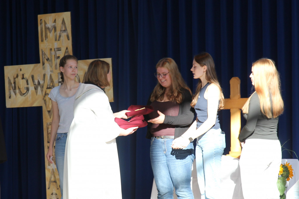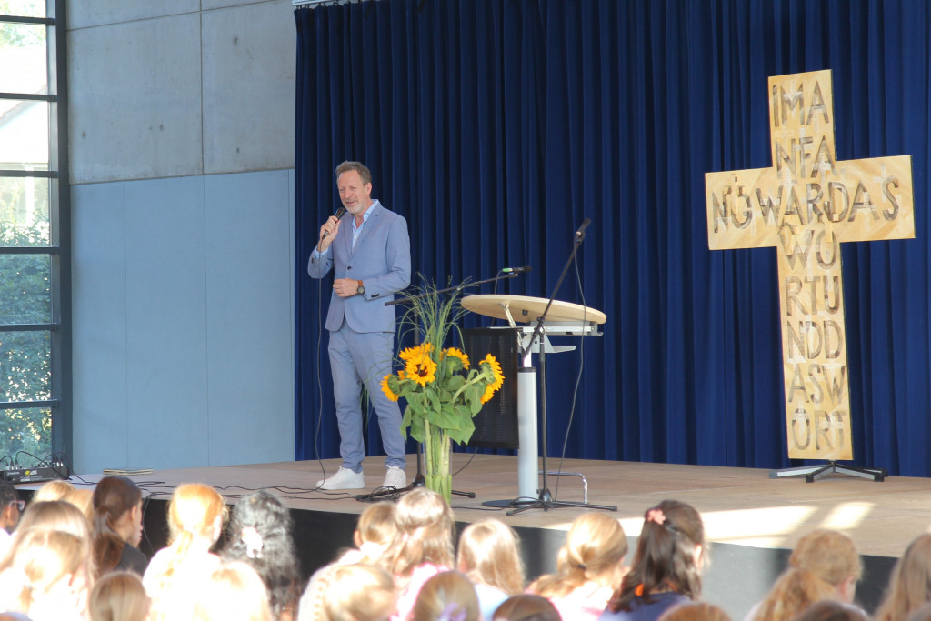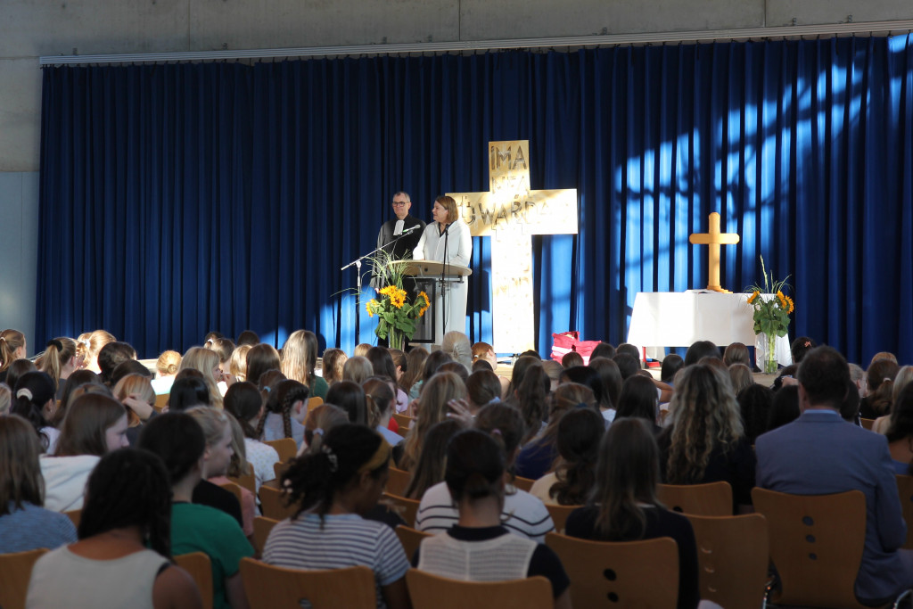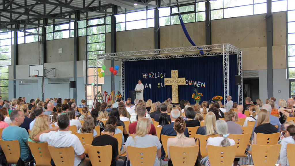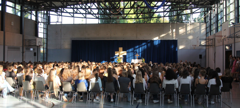 Bei leuchtender Morgensonne haben wir heute mit einem gemeinsamen Gottesdienst das neue Schuljahr begonnen. Die Wiedersehensfreude unter den Schülerinnen, Lehrkräften, Mitarbeiterinnen und Mitarbeitern war überall zu spüren, ebenso Hoffnungen und Wünsche für das neue Schuljahr, die bei der Ausgabe der Klassenkreuze an die Klassensprecherinnen vorgetragen wurden. Im Anschluss wurden unsere neuen Schülerinnen und Lehrkräfte von unserem Schulleiter Herrn Oldeweme sehr herzlich begrüßt.