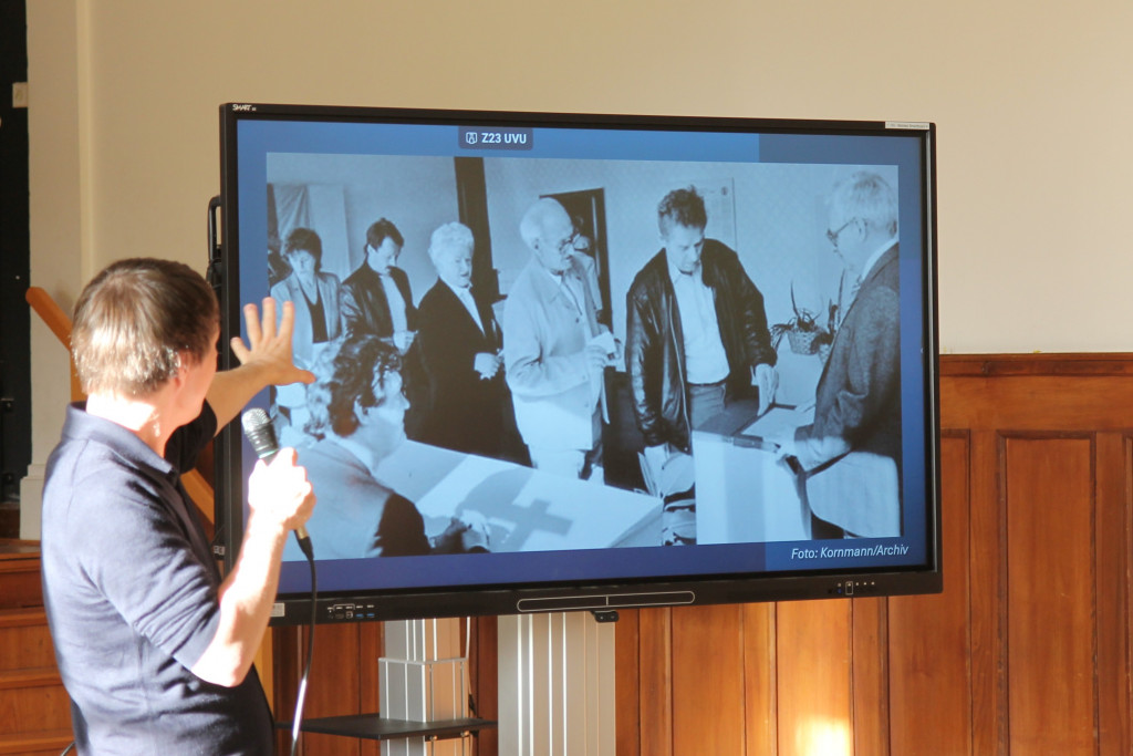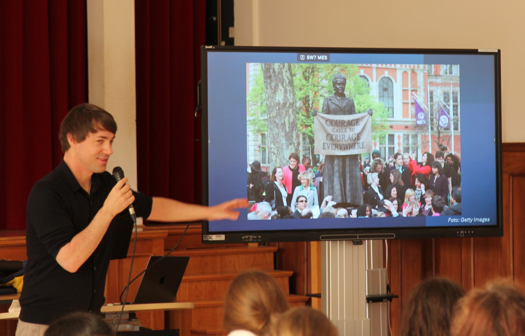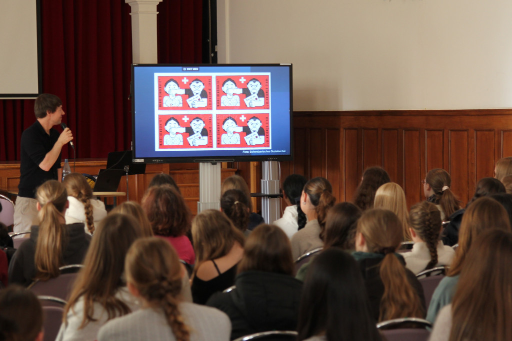 Auf dem Buchcover seines Jugendsachbuches „Demokratie“ (2024) findet sich u. a. die Zeichnung eines Demo-Schildes mit der Aufschrift „Nein“. Zunächst habe dort „Ja“ stehen sollen. Doch es sei, so Jan Ludwig, doch ein wesentliches Kennzeichen einer Demokratie, im politischen Kontext eben auch eine Gegenposition einnehmen zu können und diese auch auszusprechen. Dies sei nicht selbstverständlich. Denn, so fuhr der Journalist fort, in vielen Staaten sei dies mit großen Gefahren für das eigene Leben verbunden. Die Neuntklässlerinnen, die seinem Vortrag am Vormittag des 4. November 2025 lauschten, wurden still, als Ludwig das politische Engagement der derzeit inhaftierten belarussischen Musikerin Maria Kalesnikava beschrieb und weitere aktuelle Formen des politischen Widerstandes aufzeigte. Es folgten spannende Bildanalysen, u. a. von einem Wahlvorgang in der ehemaligen DDR, der durch die Betrachtung eines einzigen Foto entschlüsselt werden konnte. Die Schülerinnen konnten entdecken, dass auf einem Wahlzettel ohne Kästchen zum Ankreuzen, in einem Wahllokal ohne Wahlkabinen und letztlich für Wählerinnen und Wähler ohne Stift keine Wahl im demokratischen Sinne möglich war. Sie verstanden schließlich, warum diese Wahlen als „Zettelfalten“ bezeichnet wurden. Auch, warum in der Schweiz die Frauen erst 1976 das Wahlrecht erhielten, wurde durch anschauliche Fotos und Erläuterungen durch Jan Ludwig deutlich. Der Autor, der derzeit als Journalist für die Neue Züricher Zeitung tätig ist, bezog die Zuhörerinnen stetig in seine Ausführungen mit ein, sodass die Lesung eigentlich eher ein entdeckendes Gespräch wurde. Wie Jan Ludwig das Wesen der Demokratie in seinem Sachbuch darstellt, können die interessierten Schülerinnen aber bei uns in der Schulbibliothek nachlesen, wo das Sachbuch mehrfach zur Ausleihe bereitsteht. Mit dem Foto der Millicent-Fawcett-Statue, die am Parliament Square in London steht, endete Ludwigs Vortrag. In den Händen hält die britische Frauenrechtlerin ein Spruchband mit der Aufschrift „Courage calls to courage everywhere“ – ein motivierender Impuls, der auch heute noch von großer Bedeutsamkeit ist. Wir danken Herrn Ludwig sehr herzlich für seinen Besuch am SAG sowie den Kolleginnen der Bibliothek für die Organisation dieses bereichernden Beitrages im Rahmen des diesjährigen Käpt’n Book Lesefestes.